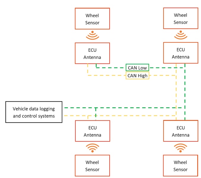 The first is a ‘learning’ system. This is where four ECUs are mounted on the car, one near each corner, allowing the system to ‘learn’ the position of each wheel and sensor fitted to the car.