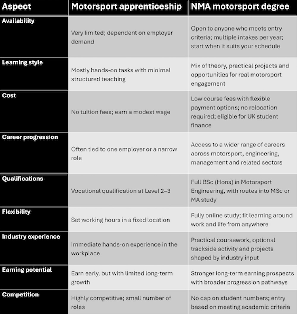 Before choosing your route into motorsport, it helps to understand how apprenticeships and degrees differ in what they offer, how they’re delivered and where they can take you.