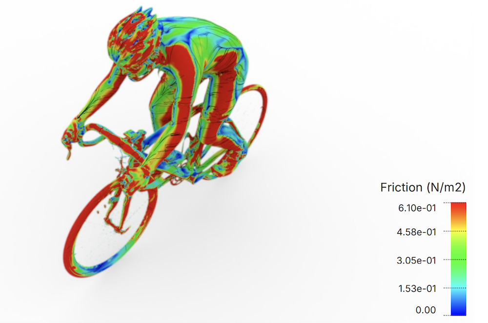 The surface friction results show a similar, aerodynamically bleak picture for the cyclist. The overall friction drag, which is the drag caused by air sliding parallel to the surface, is just a small portion of the total drag, where the majority comes from pressure drag.