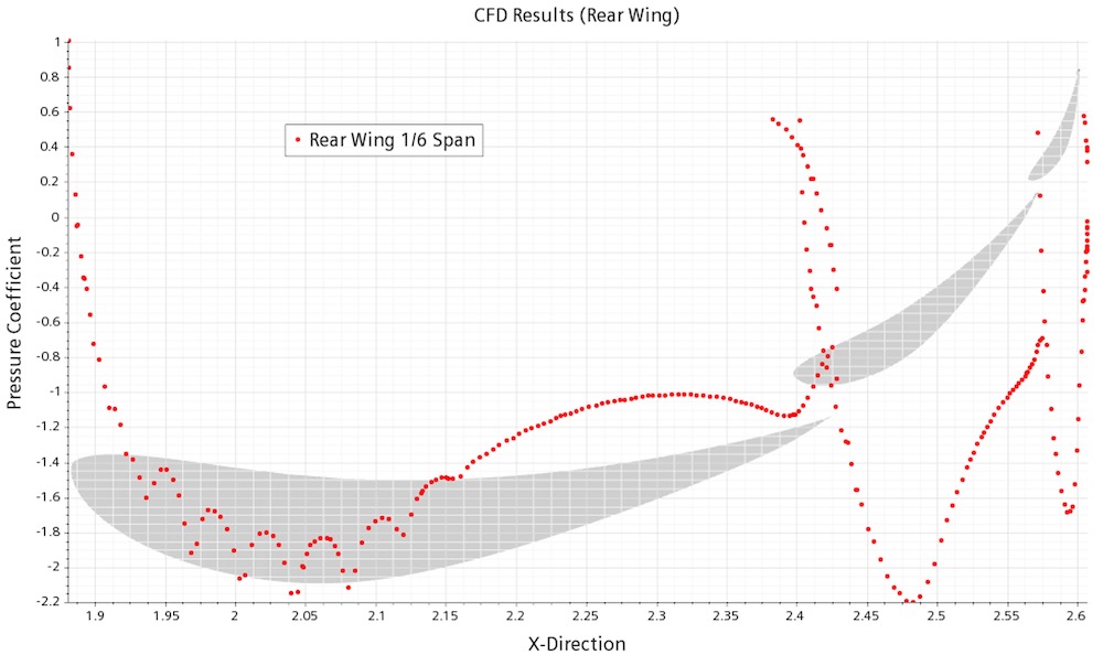 Fig 2: Pressure coefficient distribution across the rear wing