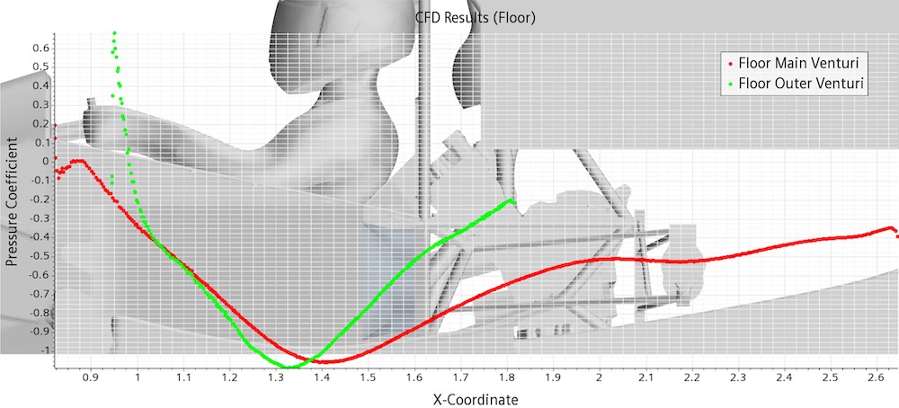 They found that the carved floor’s venturi effect worked as expected, ‘accelerating the flow and creating a low-pressure zone under the car, increasing the levels of downforce’.